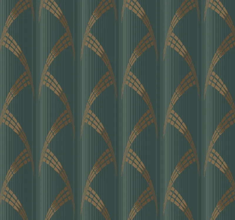 Featuring a mesmerizing vertical pattern, this CA1582 dark green metropolis wallpaper for walls consists of multi width stripes and arching window-like cones, suggesting a massive distorted cityscape.