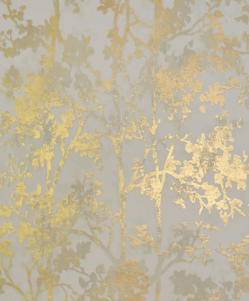 Romance dwells among the shadows of Antonina Vella Shimmering Foliage Wallpaper, where precious metals turn what could have been commonplace trees into a mesmerizing and mysterious grove.