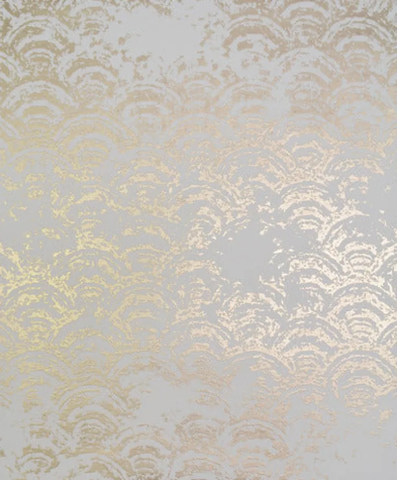 Featuring waves of frothy clouds obscuring the vault of heaven Antonina Vella Eclipse Wallpaper reflects lingering light in a pattern of metallic arcs.