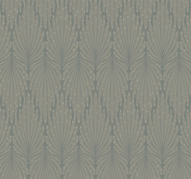 A touch of fantasy for the sophisticate, this pattern features a feathery motif, pointing upward or down, and incorporates metallic dots teathered with strings. This is Caf? Society Wallpaper.