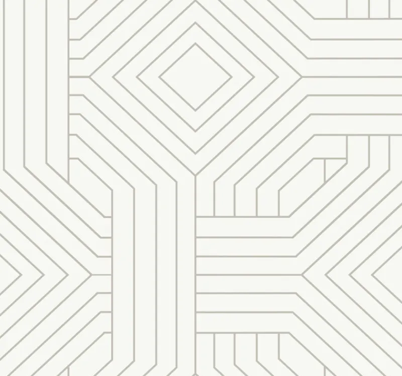 A network of gleaming metallic lines running vertically, diagonally, and horizontally forms a maze on a field of contrasting matte paper. This is Diverging Diamonds Wallpaper.