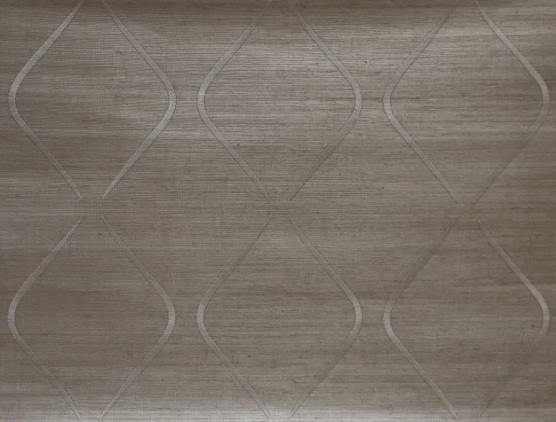 Embroidered silvery taupe geometric shapes create cool wavy diamonds on a neutral shimmery golden tan grasscloth wallpaper.