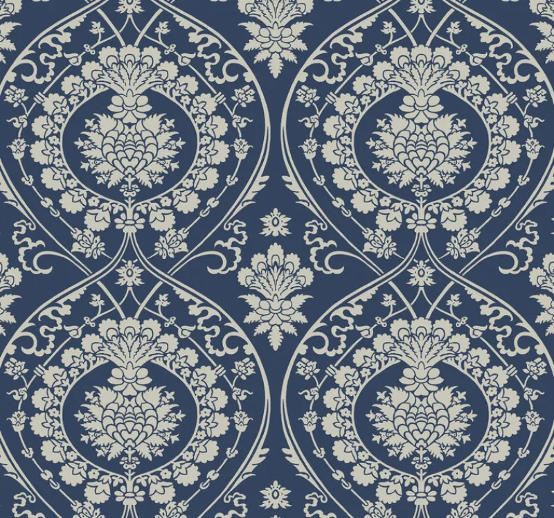 The metallic floral and scroll medallions of a vintage silk tapestry become the central theme of pattern Imperial Damask.