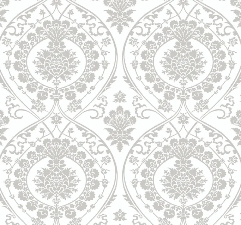 The metallic floral and scroll medallions of a vintage silk tapestry become the central theme of pattern Imperial Damask.