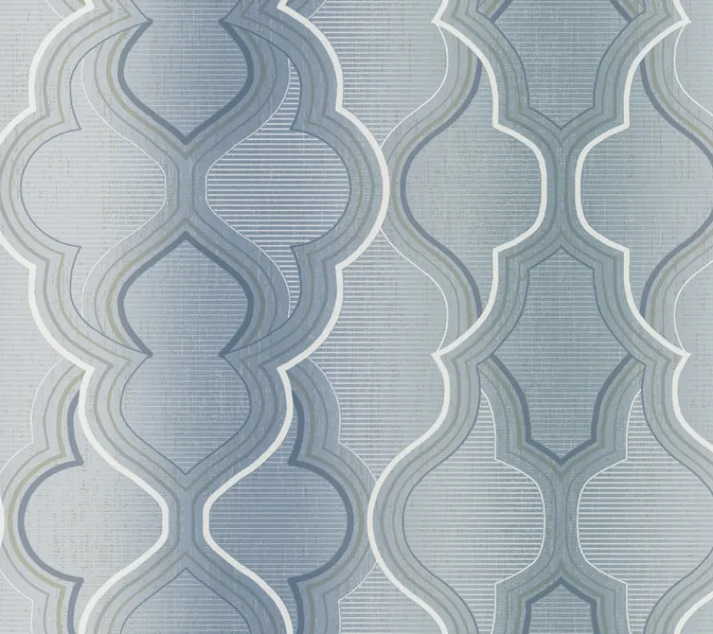 Pattern Modern Ombre Damask overlaps a quatrefoil medallion with an ombre of color and a trellis overlay, accented with metallic, for a geometric approach to classic style.