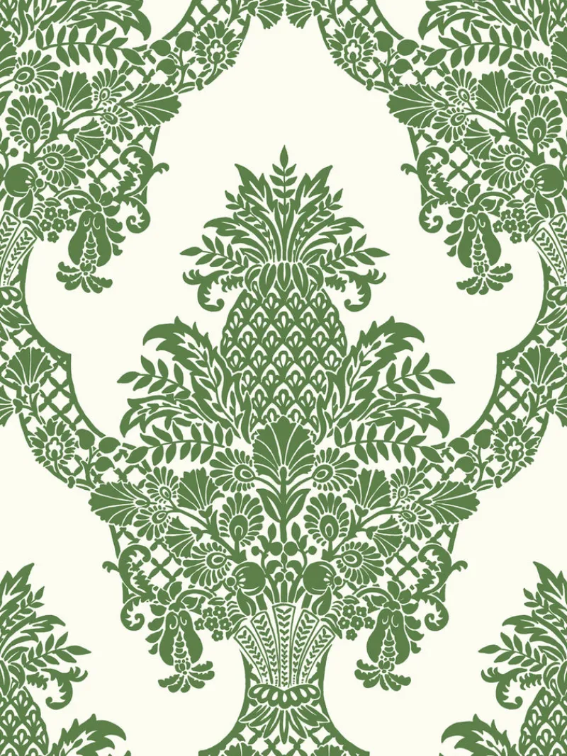 Ultimate symbol of hospitality, the pineapple commands the center of pattern Pineapple Plantation Damask, imbued with all the design elegance associated with extravagance, and luxury.
