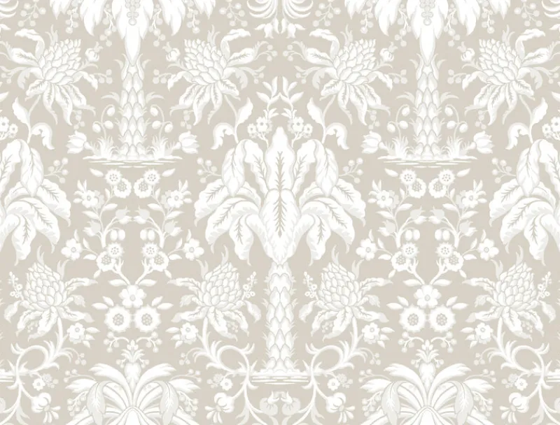 Pattern Palmetto Palm Damask’s elegant textural trees and tropical foliage are printed on natural paperweave to mimic artisan handcrafting.