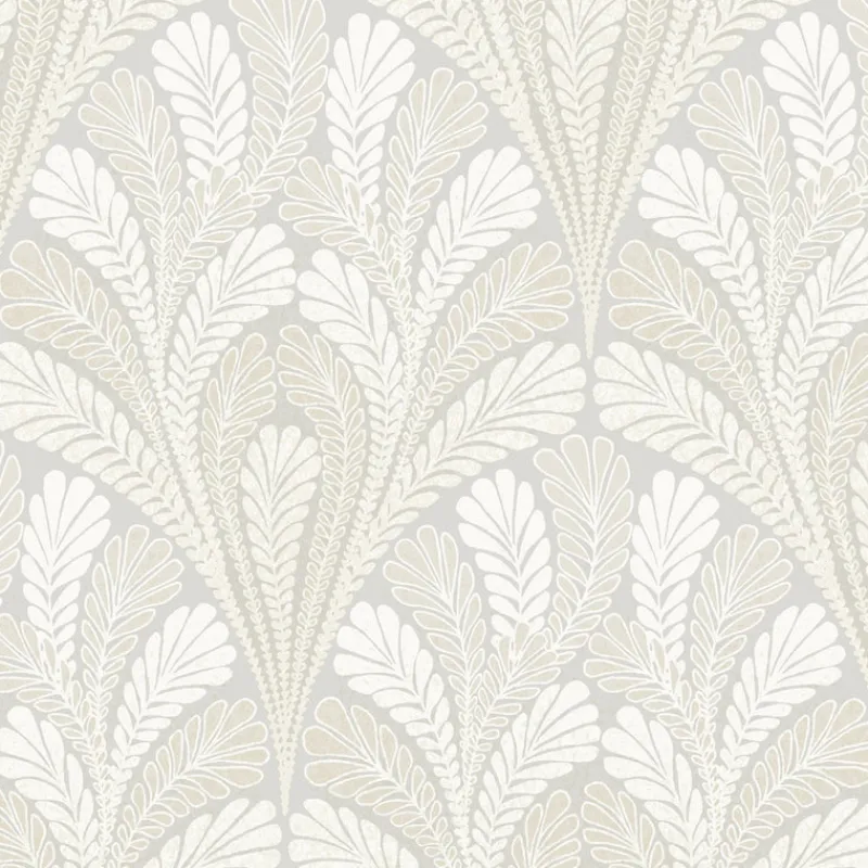 Fan shaped feathery pinnate leaves define the graceful arch of pattern Shell Damask, accented by the addition of modern metallic and pearlescence.
