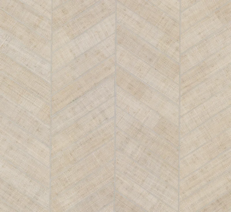 A classic herringbone pattern is achieved in pattern Atelier Herringbone with hand placed woven raffia grass strips on a metallic ground.