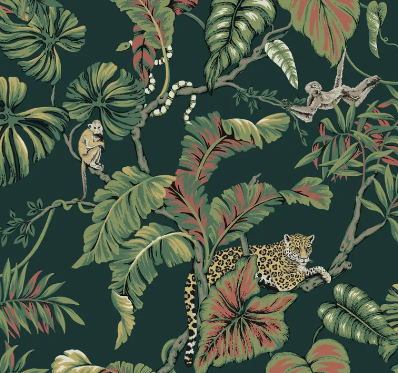 Pattern Jungle Cat places jaguars and monkeys in a canopy of tropical palm trees for a look with exotic flair.
