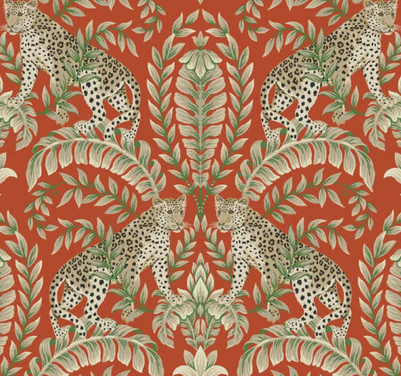 This traditionally inspired acanthus leaf damask features exotic leopards parading among the leaves.