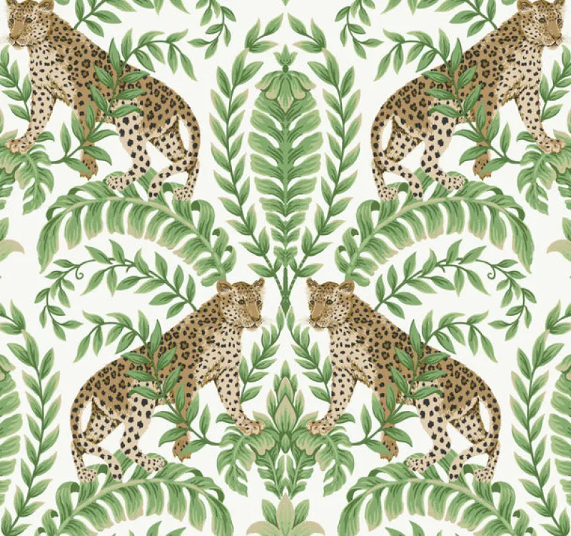 This traditionally inspired acanthus leaf damask features exotic leopards parading among the leaves.