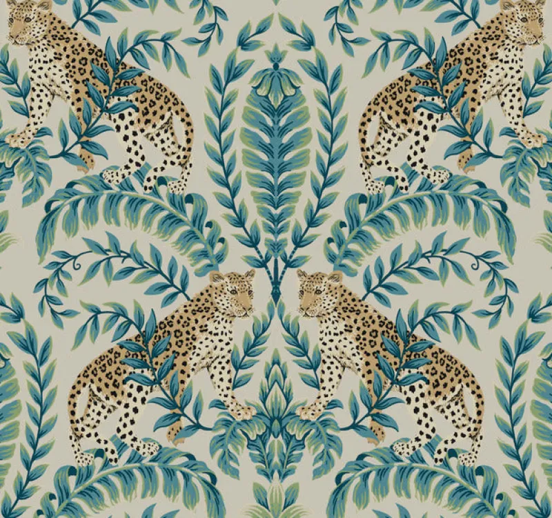 This traditionally inspired acanthus leaf damask features exotic leopards parading among the leaves.