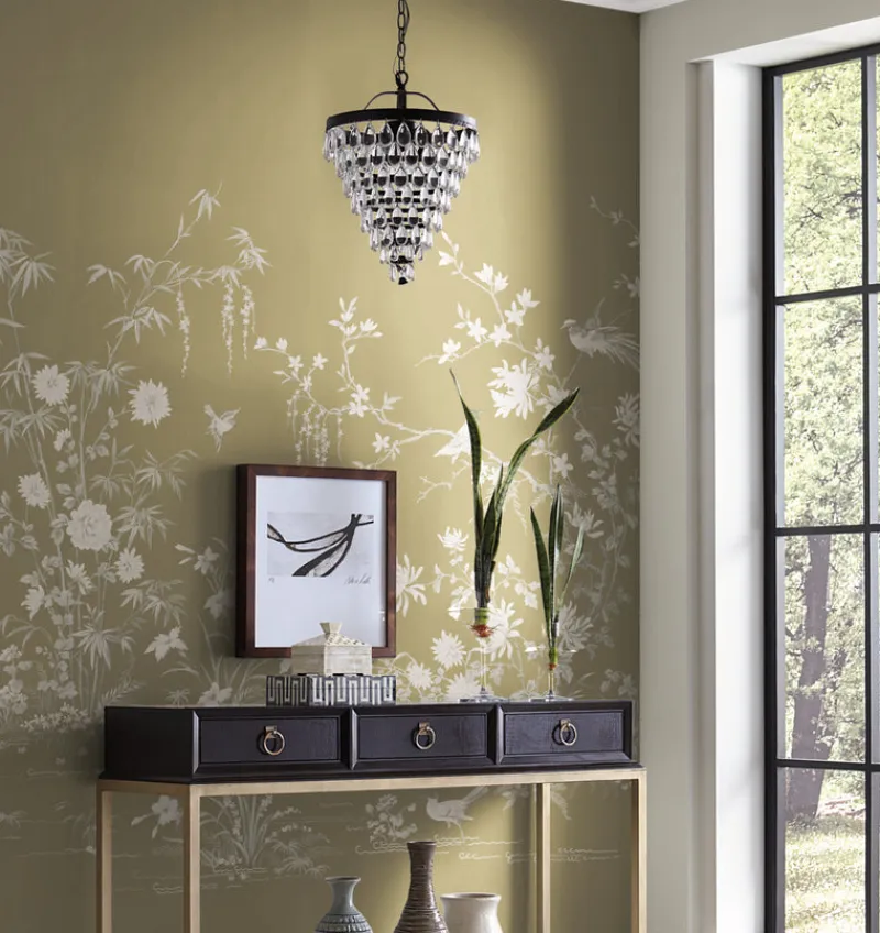The Asian scenic landscape of a wetland’s botanicals and birds flourish against a backdrop of majestic metallic shimmer in Flowering Vine Chinoiserie Mural.