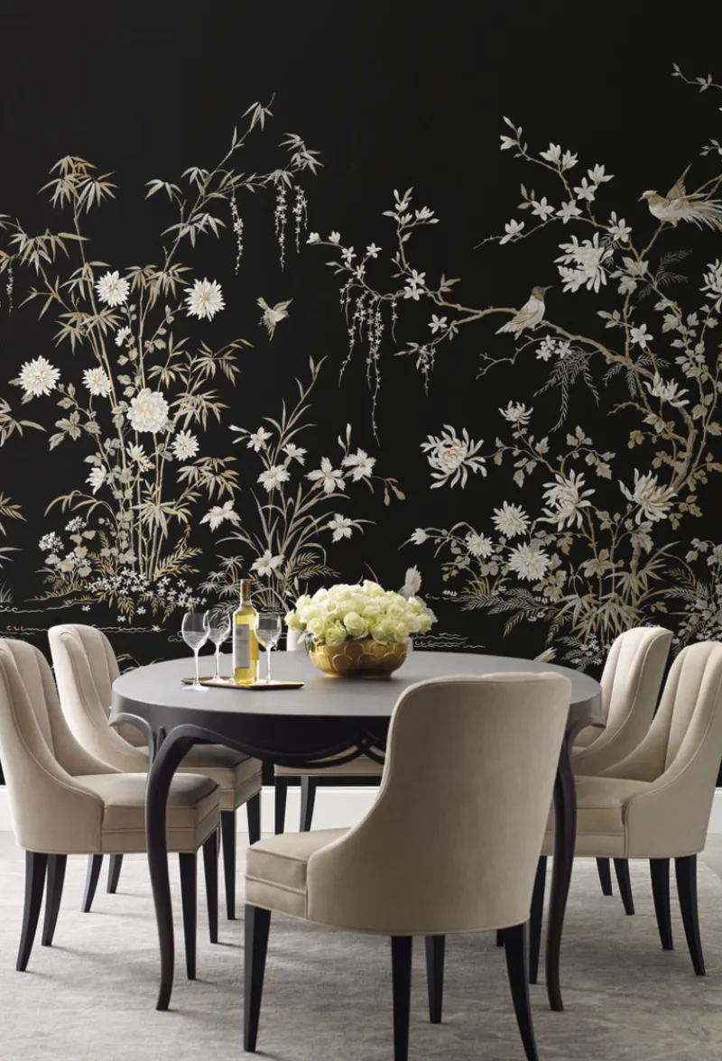 The Asian scenic landscape of a wetland’s botanicals and birds flourish against a backdrop of majestic metallic shimmer in Flowering Vine Chinoiserie Mural.