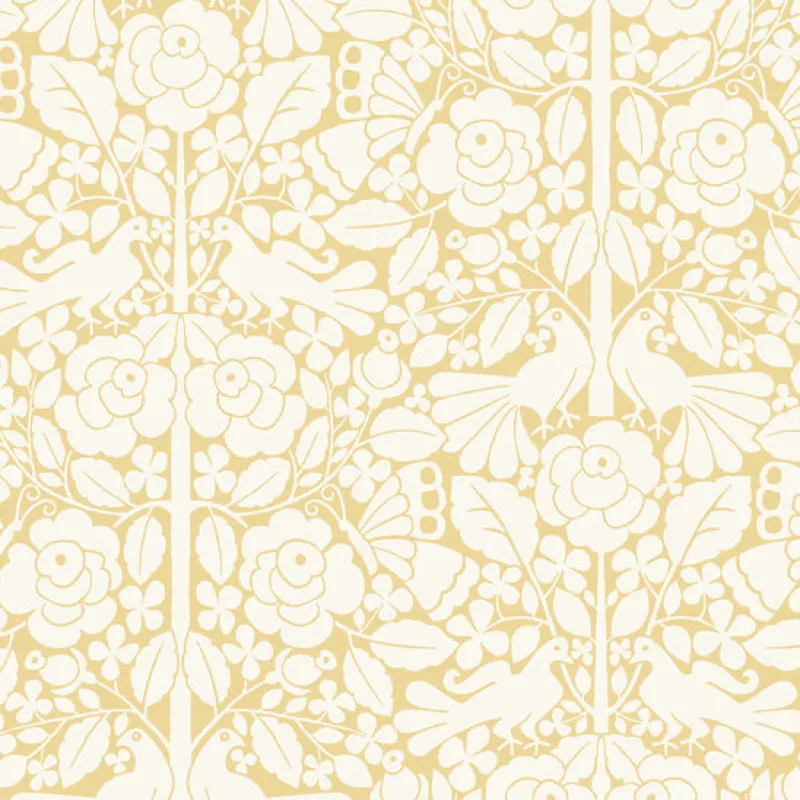 This whimsical pattern depicts an allover white painterly silhouette that is inspired by European folk art prints.