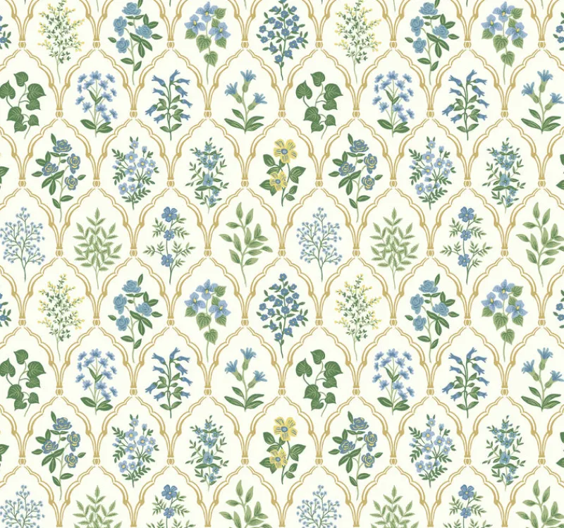 Hawthorne from Rifle Paper Co. features Sprays of assorted flowers standing under delicate arches that create a botanical grid with a vintage feel.
