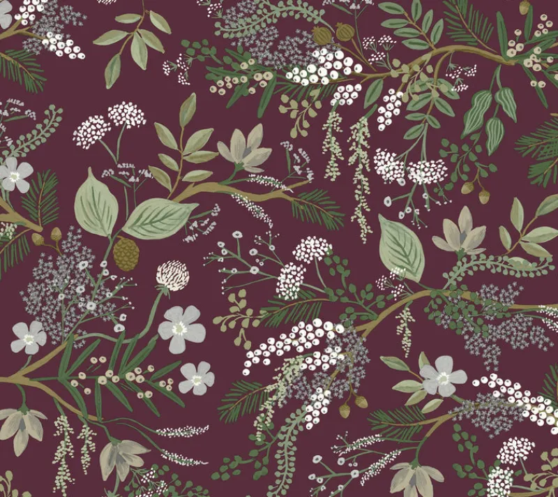 Bring the outdoors in with Juniper Forest from Rifle Paper Co., a llayered, woodsy design, featuring clusters of berries, hanging moss, and pinecones tucked into rambling stems and branches.