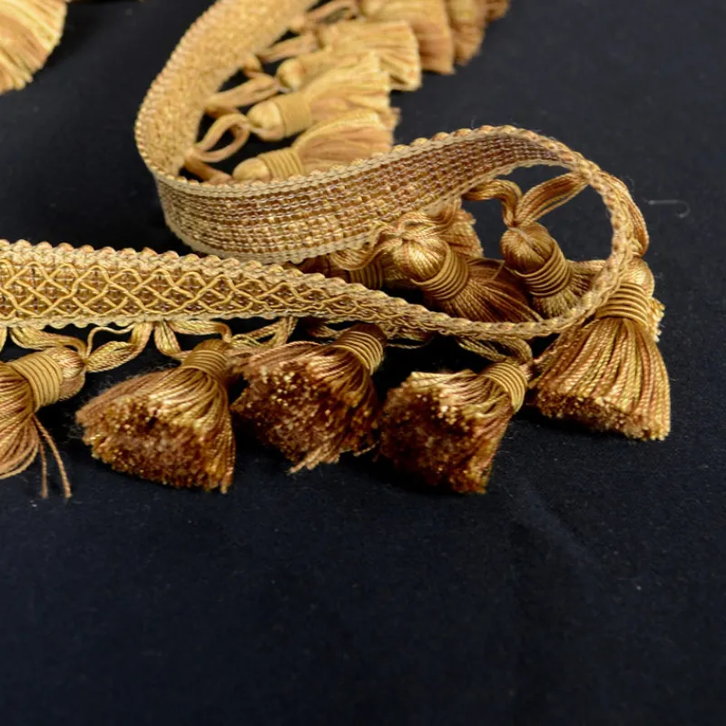 Gold tassel trim. 3″ solid gold fabric tassel fringe from the Mulberry Collection from Bellagio and Nantucket Trimmings. Beautiful decorative top banding, perfect for along the bottom edge of a window valance or sew around large throw pillows.
