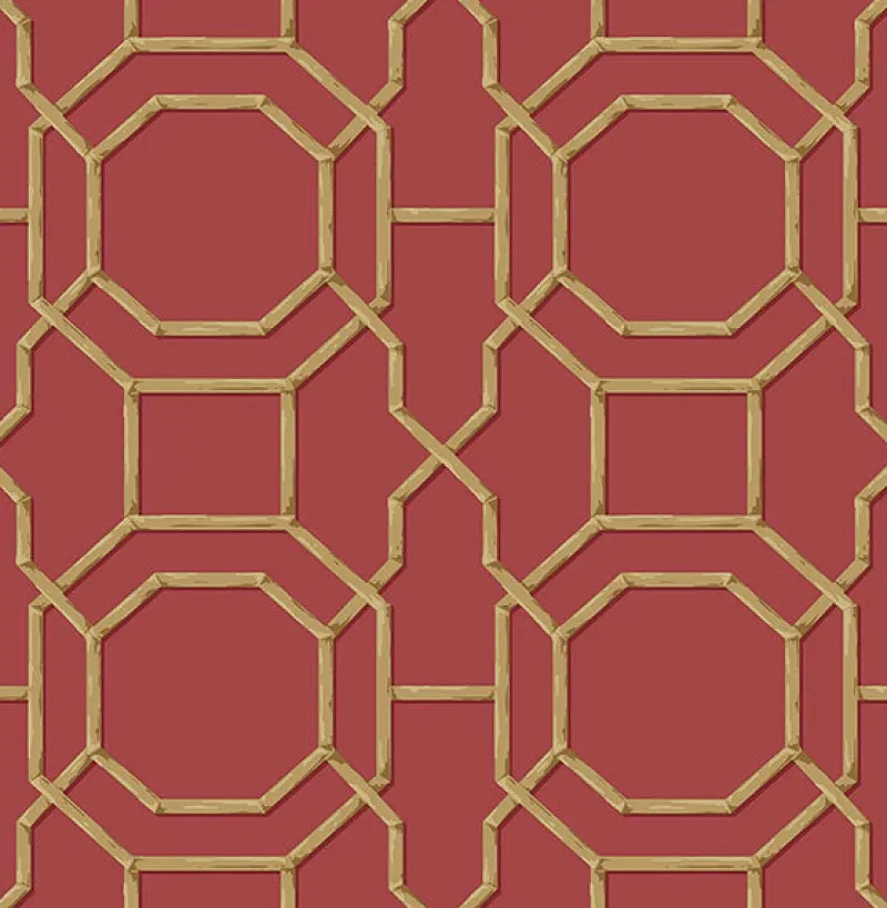 Stunning and bold, this bamboo trellis wallpaper has a globally chic style. Its bright red hue and gold metallic ink add to its dramatic flair. Rumi is an unpasted, non woven wallpaper.