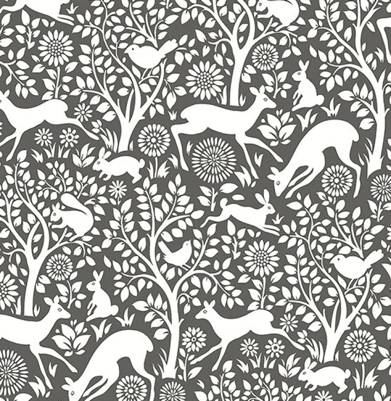 With a brown background and bright white animals, this playful wallpaper has a folky feel. Leaping deer, chirping birds, and mischievous squirrels make up this charming woodland design. Seeger is an unpasted, non woven wallpaper.