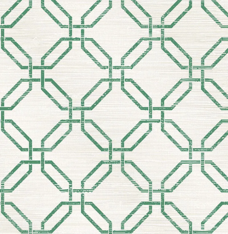 A vibrant green trellis design pops against a cream background in this textured wallpaper. With a weave pattern, green hue and silver metallic details, this chic wallpaper has a tropical feel. Phaius is an unpasted, non woven wallpaper.