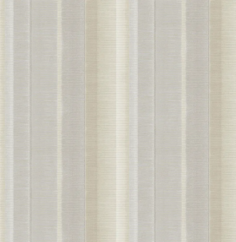 A striated metallic texture runs horizontally, creating an intriguing striped wallpaper. With simmering light grey and beige stripes, this modern neutral wallpaper is sure to brighten up any room. Potter is an unpasted, non woven wallpaper.
