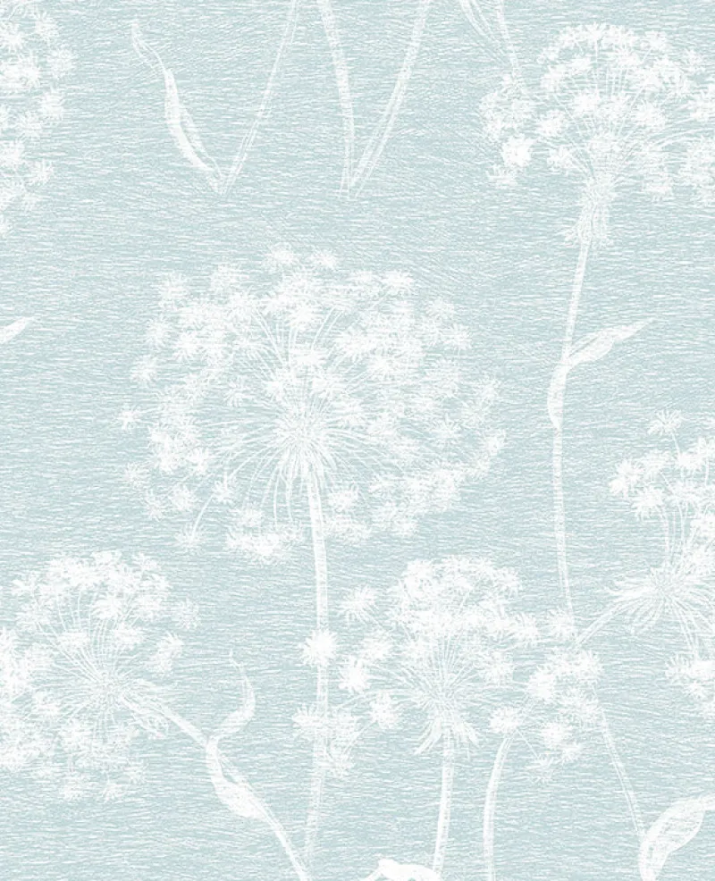 Add a soothing energy to rooms with this serene dandelion wallpaper. Its slightly distressed design has a textured look, while a light blue hue lends to its calming feel. Garvey is an unpasted, non woven wallpaper.