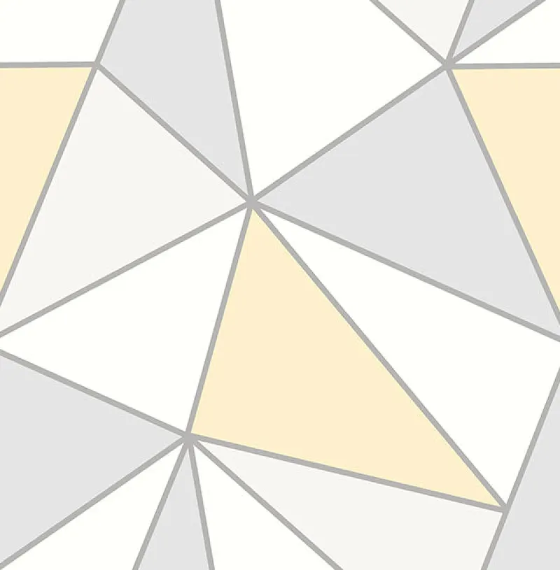 Brighten up rooms with this stunning geometric wallpaper. White, light yellow and grey triangles are framed by silver accents. Apex is an unpasted, non woven wallpaper.