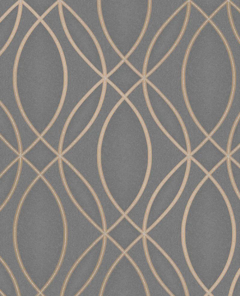 A textured taupe background grounds a bronze geometric lattice print in this luxurious design. Glittering accents emphasize its luxurious style. Lisandro is an unpasted, vinyl wallpaper.