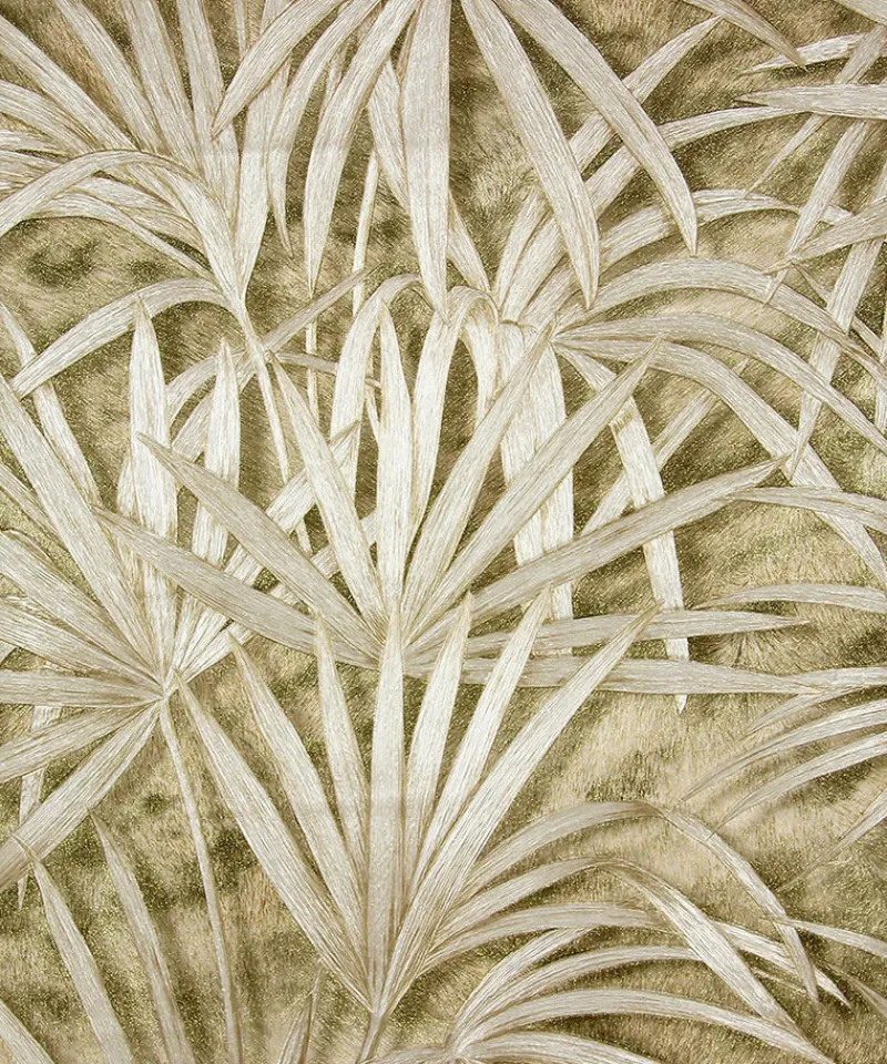 Shimmering with gold glitter details, this glamorous palm tree wallpaper has a tropical feel. Its textured design and jaguar fur inspired background add to its deluxe feel. Veneto is an unpasted, heavyweight vinyl wallpaper.