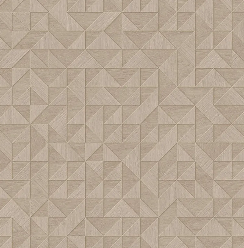 Warm taupe triangles with woodgrain detailing provide a textural look with lots of charm. The triangles form an array of patterns, giving your walls a simple, dimensional look. Gallerie is an unpasted, non woven wallpaper.