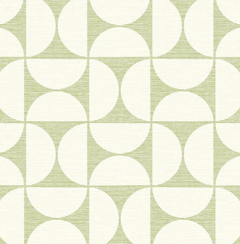 Off-white halved circles and green geometrics make up this refreshing wallpaper. Raised inks and an intricately woven design lend to its grasscloth inspired look. Deedee is an unpasted, non woven wallpaper. Pattern 2904-25670 could make a lovely and charming addition to not only your kitchen or powder room, but any room in your home!