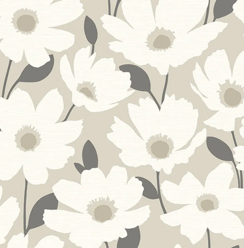 White flowers twirl about a beige background in this grasscloth inspired design. Raised inks create a dimensional look. Astera is an unpasted, non woven wallpaper. Pattern 2904-25675 could make a lovely and charming addition to not only your kitchen or powder room, but any room in your home!