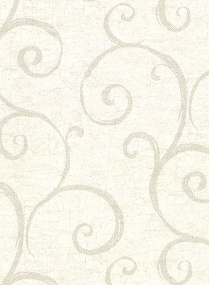 With a weathered look this textured wallpaper resembles plaster. A geometric scroll design is hosted on the cream background in a tan hue with polka dots. Newbury is an unpasted, non woven fabric back vinyl wallpaper.