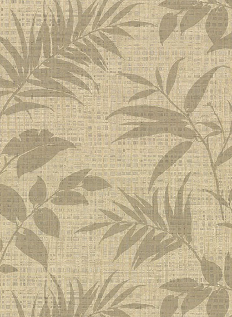 Add a tropical style to your space with this palm print design. The brown hues add a natural look to this faux grasscloth wallpaper. Chandler is an unpasted, non woven fabric back vinyl wallpaper.