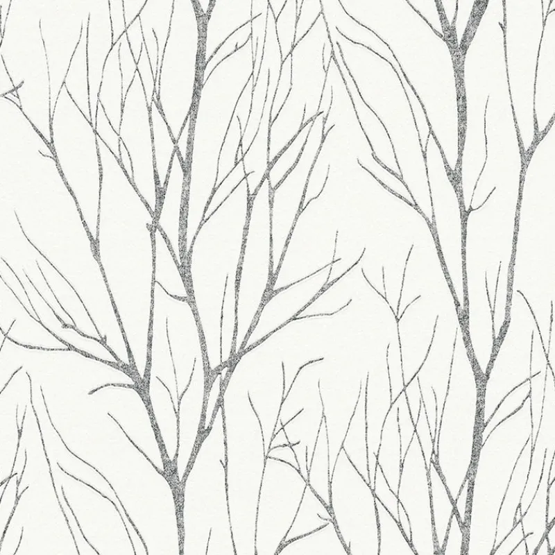 An elegant forest scene, this metallic tree looks enchanting on a crisp white backdrop. With raised inks and its neutral color palette, this earthy wallpaper will complement a variety of rooms. Diani is an unpasted, expanded vinyl wallpaper.