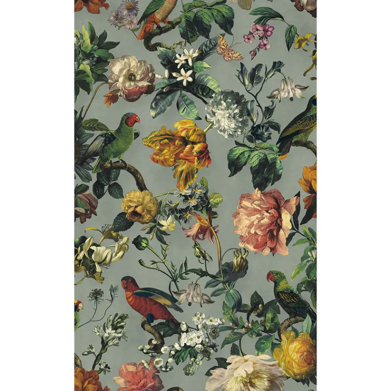 Lush green leaves and tropical blooms come to life in this gorgeous floral print. Parrots perch among the greenery, the soft sage background a tranquil counterbalance to the vibrancy of the bids and blossom. Claude is an unpasted, vinyl on non woven wallpaper.