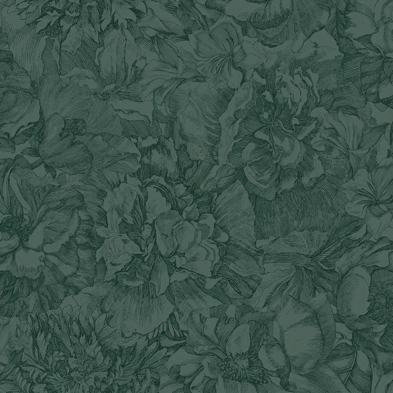 This moody botanical wallpaper is perfect for adding a vintage flair to your interiors. Its exquisite emerald design features flowers intricately inked in dark green that seem to unfurl as you look at them. Auguste is an unpasted, vinyl on non woven wallpaper.