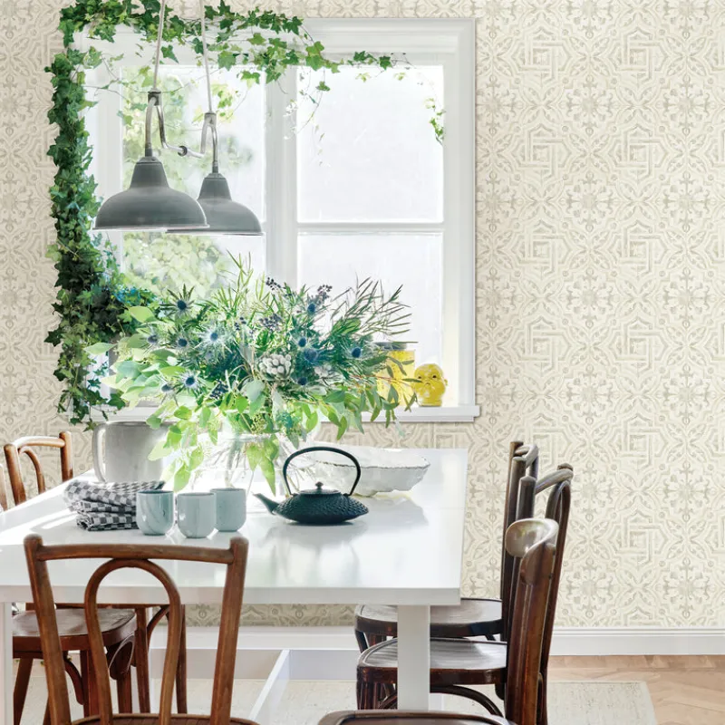 Bright and airy, this grey and champagne faux tile wallpaper is ideal for creating a rustic and chic vineyard cottage look. With Spanish inspired tiles, this pattern’s gently worn paint details give it an authentic look. Sonoma is a prepasted, high performance wallpaper.