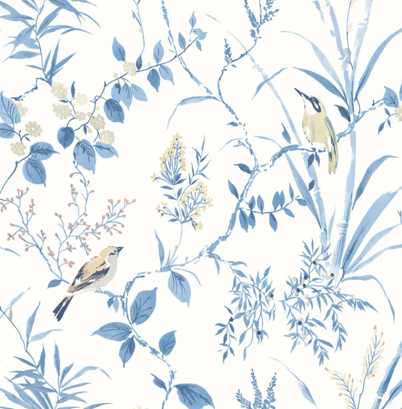 Add serenity to your home with this dreamy chinoiserie print. Sleepy songbirds and pleasing wildflowers trail amongst soothing blue bamboo, creating a romantic and tranquil feel. Imperial Garden is a prepasted, non woven wallpaper.