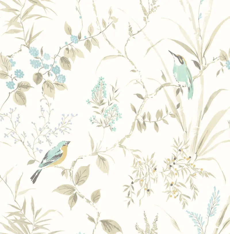 Light and airy, this romantic botanical print is teeming with life. Blue flowers and mint songbirds sit upon beige bamboo stalks in this chinoiserie wallpaper. Imperial Garden is a prepasted, non woven wallpaper.