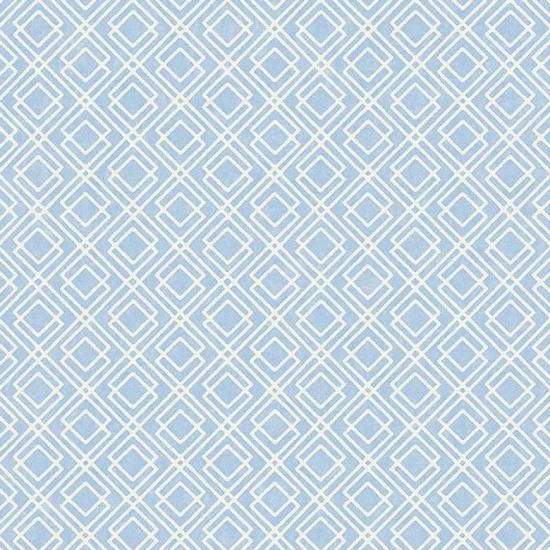 A white geometric pattern weaves across a sky blue background. Hints of worn in details bring about a vineyard cottage style. Napa is a pre-pasted, non woven wallpaper.