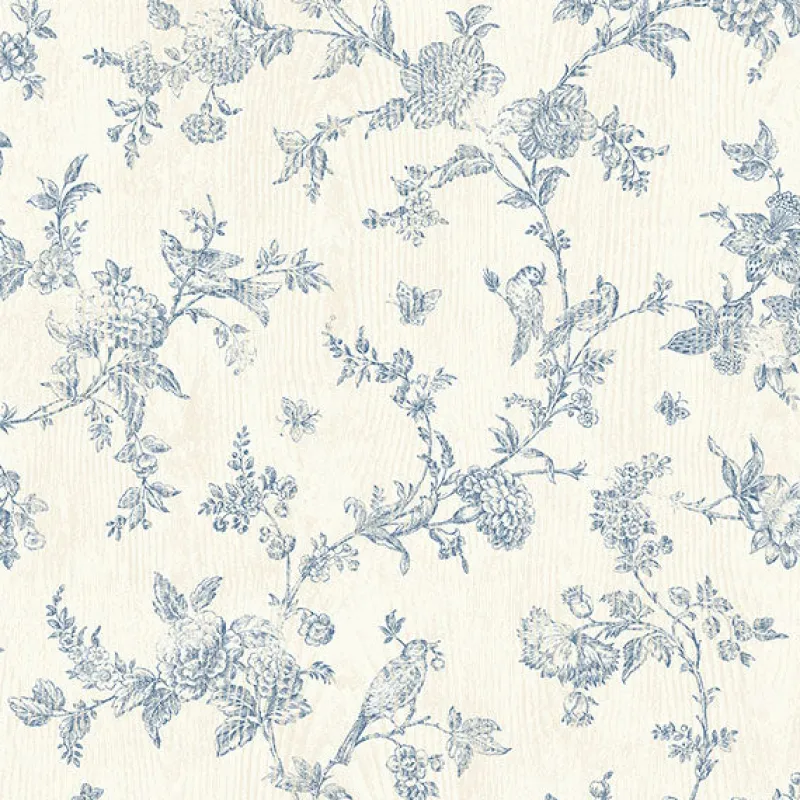 The perfect combination of soft and sweet, this floral scroll design has a chic style. Complete with a woodgrain background, flowers, and delightful birds, this blue wallpaper will bring light to any space. French Nightingale is a prepasted, non woven blend wallpaper.