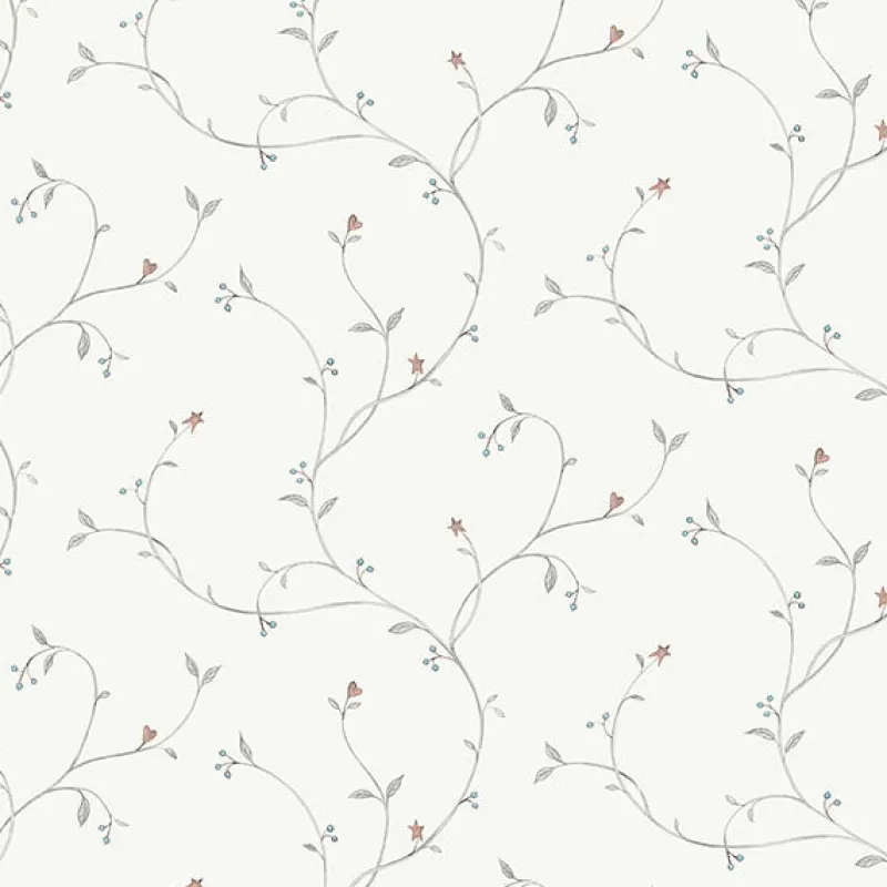 This delicate vine trail features maroon hearts and stars with faint budding accents. Its sweet design pops against a light grey backdrop. Kurt is a prepasted, non woven blend wallpaper.