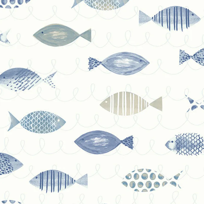 Blue, grey, and taupe watercolor fish swim across the wall with this fun pattern. Each painted with their own unique and eclectic style, this wallpaper is perfect for a beach house. Key West is a prepasted, non woven blend wallpaper.