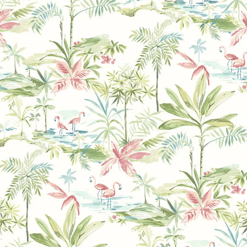 Add a vibrant pop to walls with this tropical island wallpaper. With pink flamingos, and green palm trees, you’ll be sure to replicate a tropic scene in any space. Lagoon is a prepasted, non woven blend wallpaper.