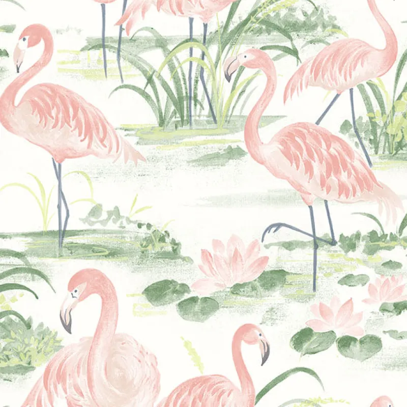 A true statement piece for any room, this flamingo wallpaper bursts with color. Its fun and whimsical pattern will make walls pop with its hand painted design and pink and green hues. Everglades is a prepasted, non woven blend wallpaper.