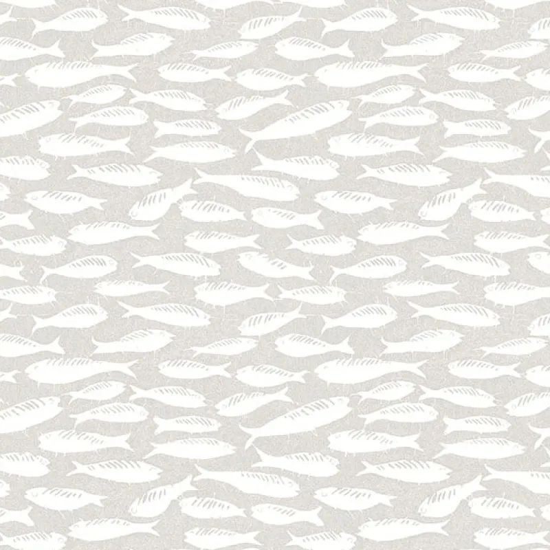 Enjoy a playful take on coastal charm with this Scandinavian-inspired wallpaper! A school of sardines are inked in white against a light grey backdrop with delicate fabric detailing. Nunkie is a prepasted, acrylic coated paper wallpaper.