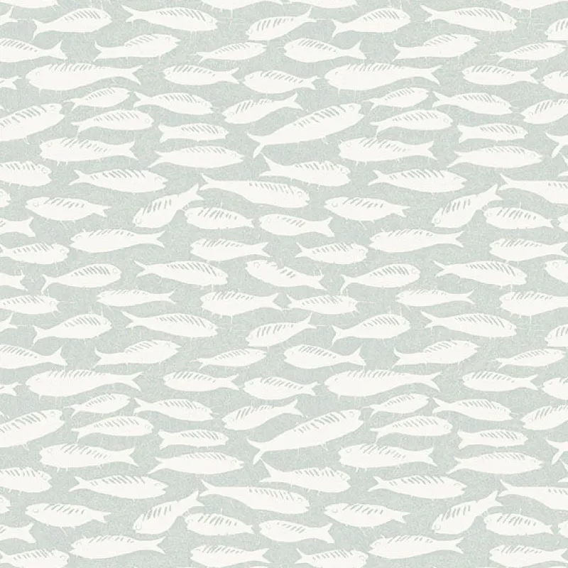 Coastal design has never been so charming as this Scandinavian-inspired wallpaper! A school of sardines is inked in white against a finely woven pale blue faux linen backdrop. Nunkie is a prepasted, acrylic coated paper wallpaper.